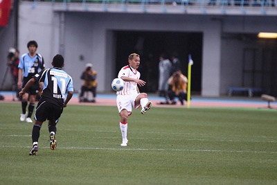 札幌から移籍のダヴィ選手(背番号9:FW)が、強烈なドリブルを仕掛ける